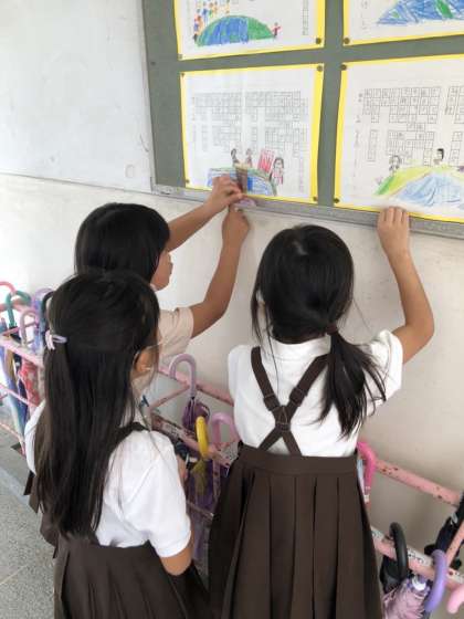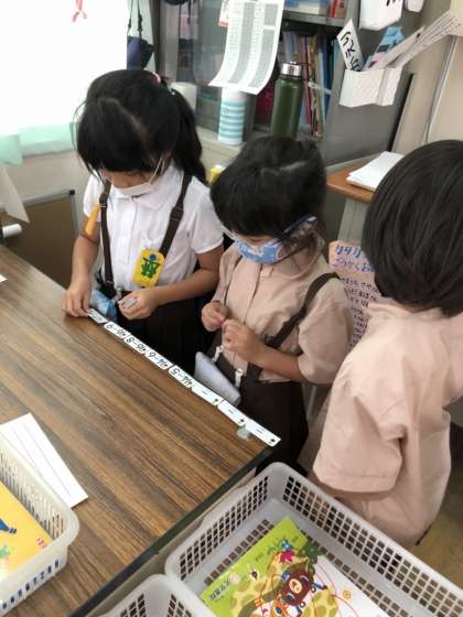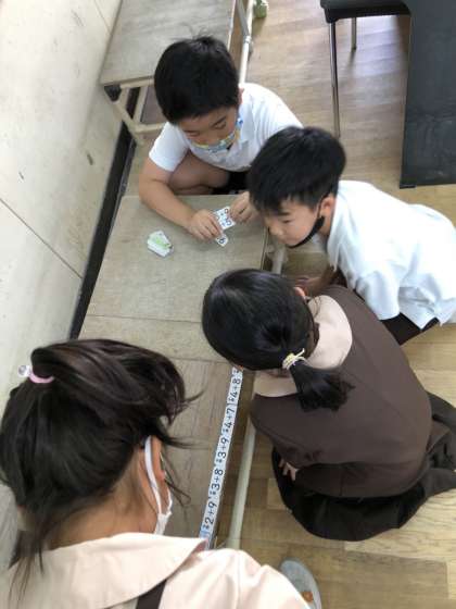 昨日の算数で、計算カードなどみんなが同じ長さのもので長さを調べるとよいことがわかった子どもたち。今日は、班で調べたいものを決めて調べました。オルガンを調べた班はどちらもカード14こ分になりました。