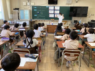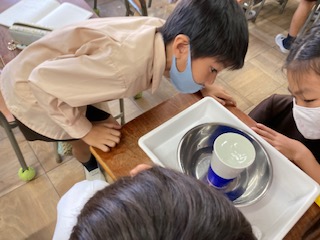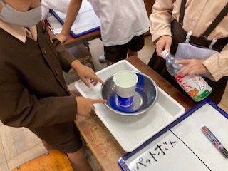紙コップとペットボトルではどちらがたくさん入っているか、予想を立て、調べ方も考えて確かめました。コップにペットボトルの水を移し替えたり、同じ大きさの入れ物に入れ替えて比べました。