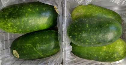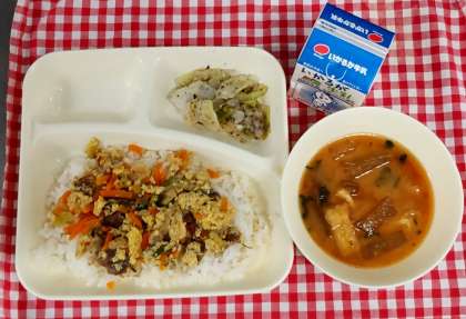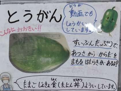 今日は他人丼、とうがんのみそ汁、キャベツの赤じそ和え、牛乳でした。大きな冬瓜が給食室に届きました。冬瓜には夏の暑さや冷たいもので疲れた体を助ける働きがあります。