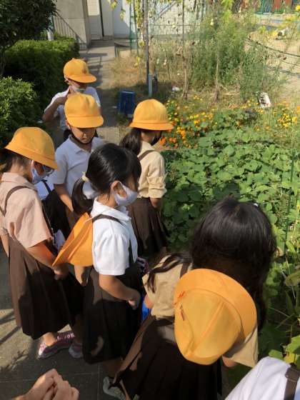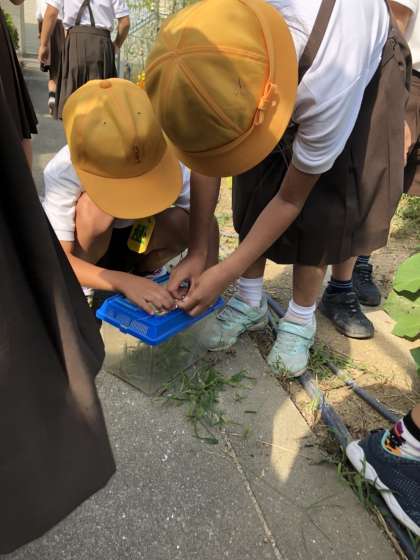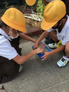 生き物を観察するので、虫探しをし、飼育ケースに捕まえました。みんなの勉強のために、虫たちには、ちょっとだけ1年の教室に引っ越ししてもらいました。観察後、元気なまま畑に帰ってもらえるように、みんなで世話をすることにしました。