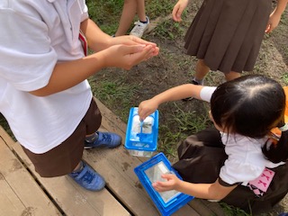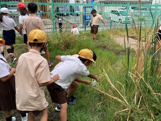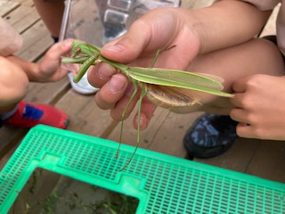 2年生が、ビオトープで大きなカマキリを見つけ、教室で飼っています。お腹に大きなたまごをかかえています。