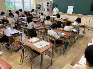 図書室に行く前に、先生の話を聞いています。「読書ノート」の締め切りが近づいてきています。目標は達成できそうかな?