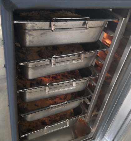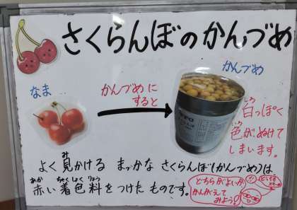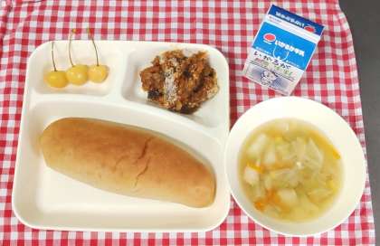 今日は、なすのミートグラタン、鶏肉と野菜のスープ、さくらんぼ(缶詰)、黒糖パン、牛乳でした。大阪市の給食では、着色料を使っていないさくらんぼの缶詰めを提供しています。