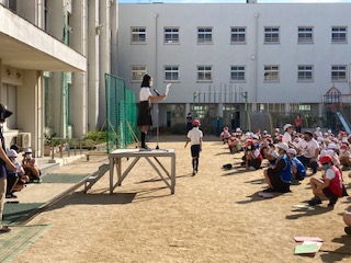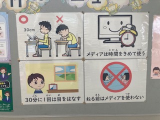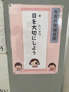 今月の保健目標は、「目を大切にしよう」です。保健室前にもどんなことに気をつけると良いかが掲示してあります。月曜日の児童集会でも、健康委員会児童が呼びかけました。