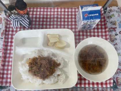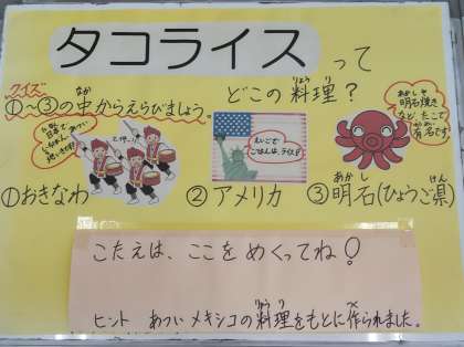 今日はタコライス、もずくのスープ、焼きじゃが、牛乳でした。タコライスは沖縄で考えられた料理です。タコスの具をご飯の上にのせています。