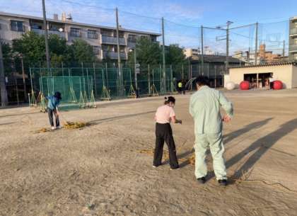 金曜日が雨の予報なので、職員が事前にロープやくいうち等、運動会の準備を行いました。