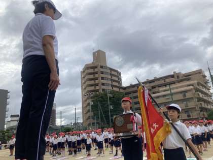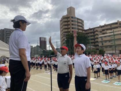 各組の代表が、優勝旗・準優勝盾を、返還しました。選手宣誓に合わせて、みんなもスローガンのところを発声しました。