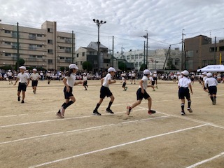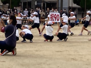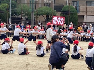 全力で入場してダンスを披露!その後は、力いっぱい綱引きです。「祝90」のプラカードを元気よく振って応援です!!