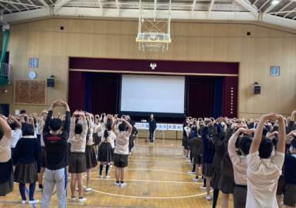2時間目に、走り高跳びのトップアスリートである福本幸さんに講演をしていただきました。選手時代のすばらしい跳躍力の映像を見たあと、楽しみながら体を動かすこと、継続すること、思いやりや出会いの大切さ等、子どもたちに熱く語っていただきました。筋力アップに向けた6つの動きも教えていただきました。
