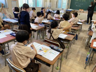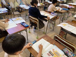 身の回りにあるもので、かけ算で数を求めることができるものを探しました。靴箱やロッカーの数、タブレッ保管庫に空いている穴など、何??何まで求めることができるかノートに書いて発表しました。