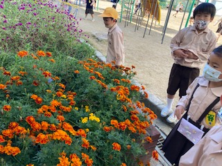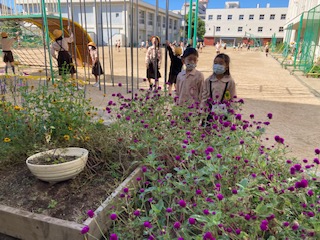 休み時間、教室前の花壇で虫探しをしています。バッタが見つかりました!