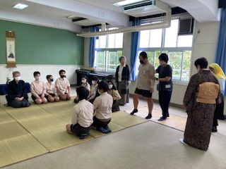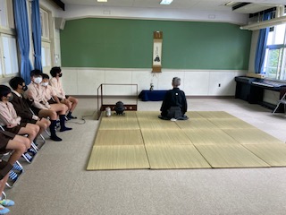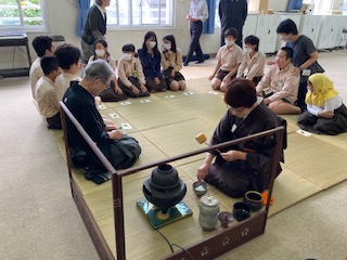 掛け軸には「和敬清寂」と書かれています。千利休から伝わる茶の湯の心を味わい、浸りました。茶室に見立てた部屋への入り方も、今日は座りませんでしたが、部屋に挨拶をするということも教えていただきました。
