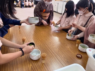 抹茶の粉を茶杓でとり、茶筅を使ってたてました。とても上手だと褒めていただきました。