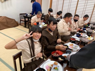 検温をした後、夕食です。食事係の挨拶で、いただきまーす!