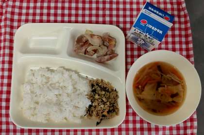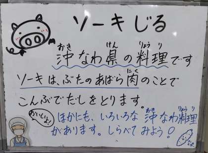 今日は鶏肉の柚子塩焼き、ソーキ汁、ツナ大豆そぼろ、ご飯、牛乳でした。栄養満点のふりかけでご飯も食べやすかったようです。