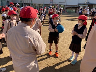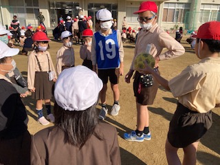 集会委員会が考えたゲームをたてわり班で行いました。丸く円になり、しりとりをしながらボールを回していくゲームです。低学年の子が思いつかなくて考えていると、がんばれ!ど応援したり、ゆったりと待ってあげたりする上級生の姿が印象的でした。