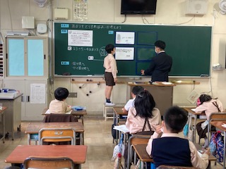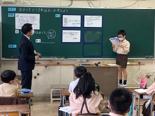 あまりを入れずに答えを出すという考えと、あまりをの分を足すという二つの考えが出ました。なぜそうなるのか、具体的に説明するのがなかなか難しいのですが、友達の意見に付け足しをしながら、みんなで答えを出してまとめることができました。間違った考えも、みんなが深く考えることができ、授業後、みんなから拍手が起こりました。