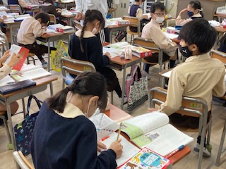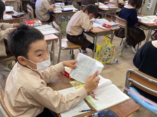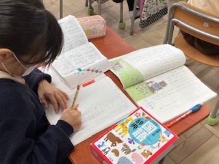 言葉の意味調べをしています。国語辞典の使い方がとても速くなってきました。引いた言葉には、赤鉛筆での印や付箋が付いています。
