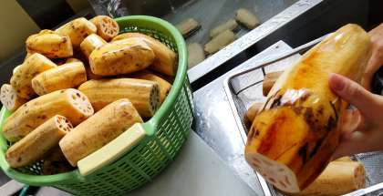 今日は豚ひき肉のジューシー、さつまいものみそ汁、焼きれんこん、牛乳でした。ジューシーは沖縄の郷土料理で混ぜご飯のことです。