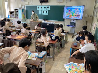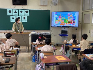 ○や△などの形をテキストから探し、それがいくつあるか見つけて英語で発表しました。形の名前も英語で覚えています。