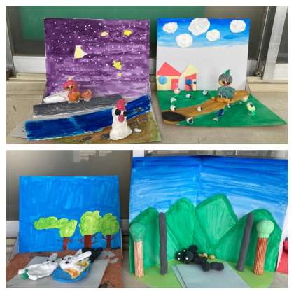 お話の世界を粘土などを使って表現しています。さて、何のお話か分かりますか?