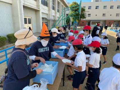 炊き立ての美味しいご飯(PTA役員の方に大きな釜で炊いていただきました)が届きました。いよいよカレーの出来上がりです!