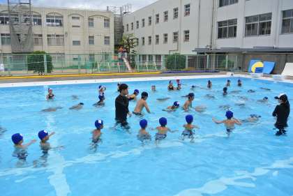 PTAの方が玄関受付を担当してくださり、受付後子どもたちは体操をしてプールへ。
