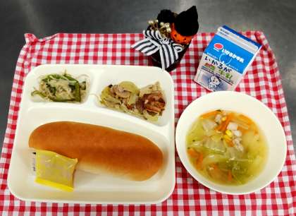 今日は、豚肉のカレー風味焼き、白菜のスープ、もやしとピーマンの炒めもの、コッペパン、アプリコットジャム、牛乳でした。秋は実りの秋と呼ばれ旬を迎える食べ物が豊富です。