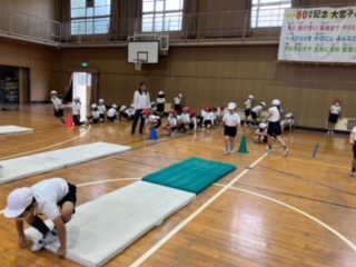 前転や後転の復習をしました。その後、跳び箱の練習をしました。跳び箱を縦にし、開脚跳びにも挑戦しました。