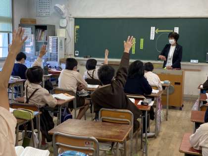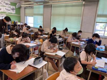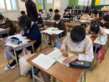 「大造じいさんとがん」の学習は、校長先生と学んでいます。昨日の感想交流で出た疑問などを解決するため、一人学び学習をしました。みんなで交流する前に、まずは、自分で考えることができます。情景描写も沢山探していました。