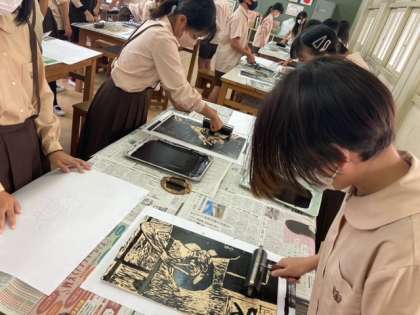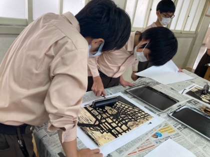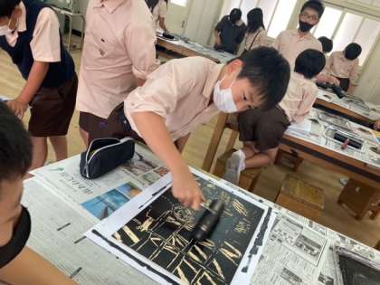 頑張って掘り進めてきた版画板。今日はインクをつけて刷りました。どのように仕上がるか楽しみですね。