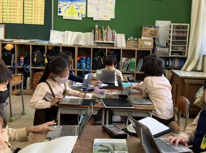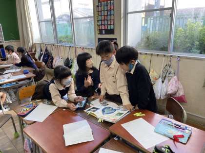 国語で学習した「ビーバーの大工事」のように、いろいろな動物のひみつを調べています。図鑑やインターネットで必要な情報を集めています。