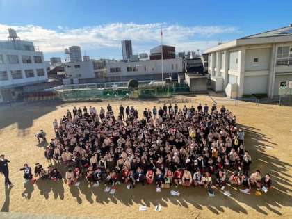 児童集会の後、全校で写真を撮りました。創立90周年の記念品の写真に使うための予備の撮影です。来週の月曜日、本撮りをします。上着を着用で登校させてください。
