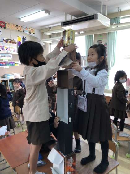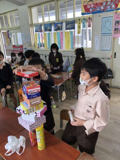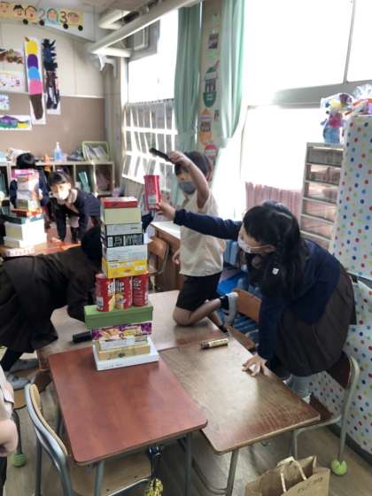 かたちあそびの学習をしました。高く積むにはどうしたらいいか考えたり、箱を形で仲間分けをしたりしました。