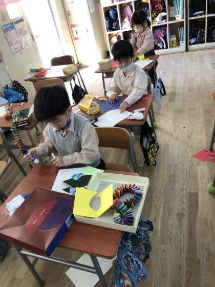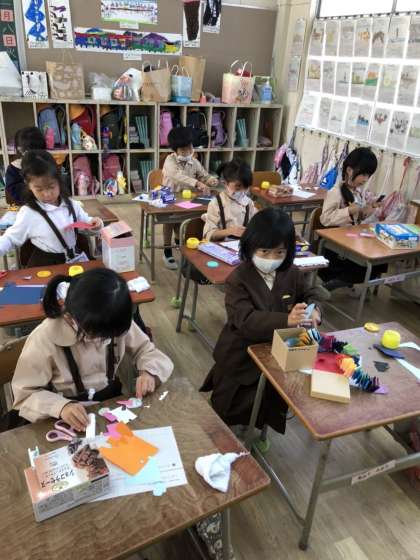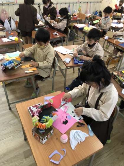 びっくり箱の中に、見た人がびっくりするものを作りました。イメージを膨らませて、見たこともないお化けや妖怪を作っていました。お家の人をびっくりさせることができたら、大成功です!