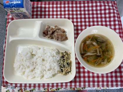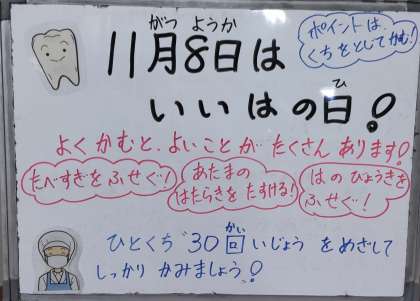 今日は豚肉のスタミナ焼き、すまし汁、とりなっ葉いため、ご飯、牛乳でした。11月8日は、いい歯の日です。よく噛むことは胃腸の働きも助けます。季節の変わり目の不調に負けないように、一口30回以上噛むのがおすすめです。