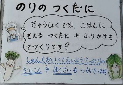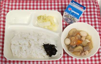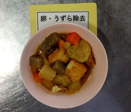 今日は関東煮、白菜の甘酢づけ、のりの佃煮、ご飯、牛乳でした。関東煮はおでんとも呼ばれ様々な具材を使います。うずら卵の除去食も用意しました。のりの佃煮は海苔の香りも食欲をそそる手作りの佃煮です。