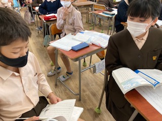 最後の場面を学習しました。「ひきょうなやり方」とはどんなことかで、議論が白熱しました。ペアで意見を述べ、全体で話し合いました。文中の言葉や文を手がかりに考え、根拠と理由を明らかにして発表しました。