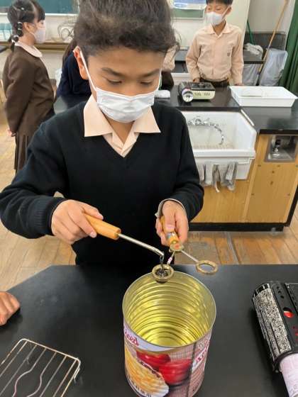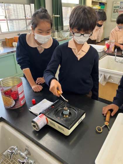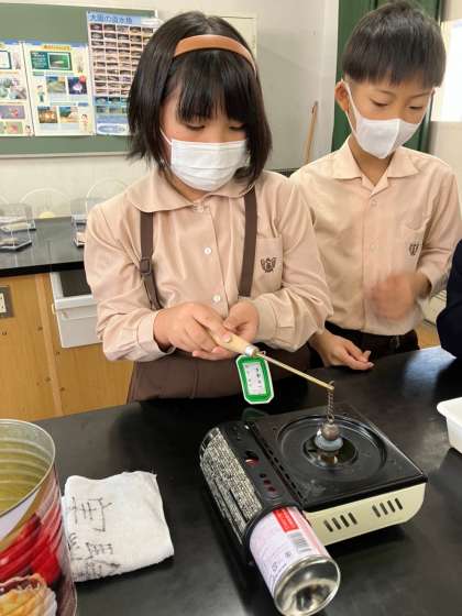 金属の体積と温度の関係を調べる実験をしました。金属の球が冷やされて体積が小さくなり、通らなかった輪に入ると驚きの声が出ていました。