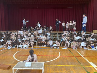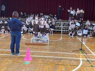 学習発表会の練習です。舞台やひな壇、前の台など立つ位置を覚えるだけでも大変です。一生懸命頑張っています!