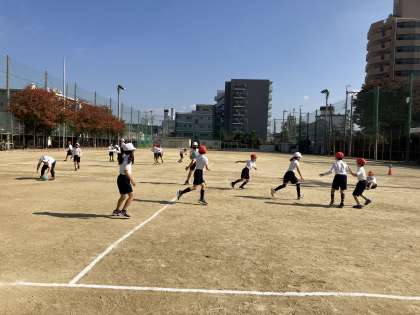 外では、ボール投げの練習をしています。ボールを的に当てたり、パスを回したりするゲームにも挑戦しています。
