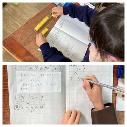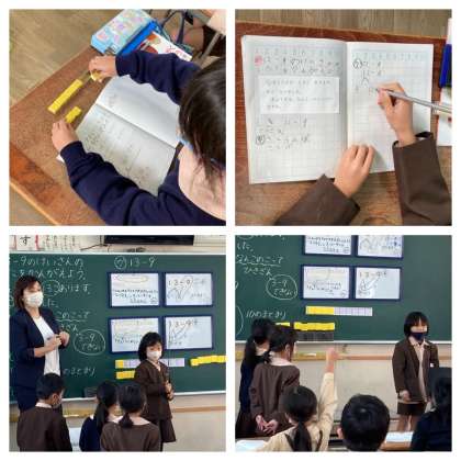 22日の研究授業のプレ授業を行いました。今までに習ったことのない、くり下がりのある計算に初めは戸惑い気味でした。けれども、答えをブロックやさくらんぼ計算、図などを使って求めました。いろいろな考え方が出て、ペアで交流したり、全体で共有しました。どの子も自分の考え方をノートに書くことができました。