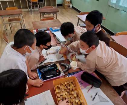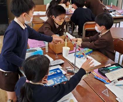三角定規や消しゴムなどの重さが、つみ木でいくつ分なのかを調べました。