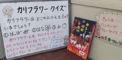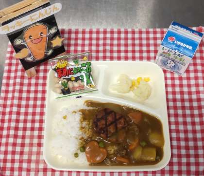 今日はハンバーグカレーライス、カリフラワーのピクルス、豆こんぶ、牛乳でした。
