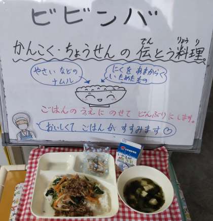 今日はビビンバ、わかめスープ、アーモンドフィッシュ、牛乳でした。ビビンバは韓国朝鮮の伝統料理です。本格的な味になるように、肉の具と野菜の具を分けて配缶しました。人気の献立です。