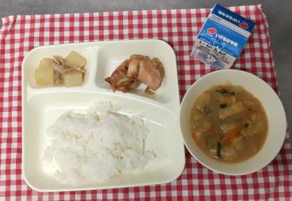 今日は鶏肉の甘辛焼き、みそ汁、大根の煮もの、ごはん、牛乳でした。冬が旬の野菜には、風邪など病気を防ぐビタミンなどが豊富です。給食にもたくさん登場します。