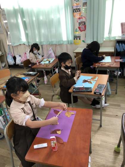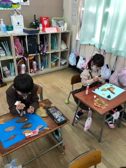 先週拾った落ち葉や、集まったどんぐりを使って絵を描きました。みんな思い思いに好きなものを作っていました。