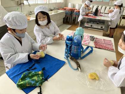 茶巾のように包んでおいしく頂きました。「甘くておいしい!」と子どもたちは大喜びでした。