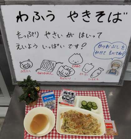 今日は和風やきそば、きゅうりのしょうがづけ、いり黒豆、ミニ黒糖パン、牛乳でした。給食の焼きそばは具だくさんで大人気です。どのクラスも食缶からっぽで返ってきました。