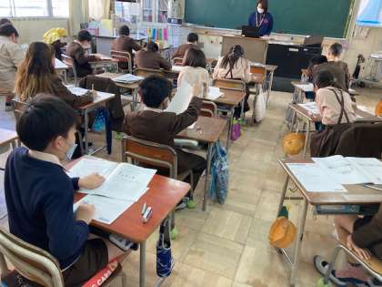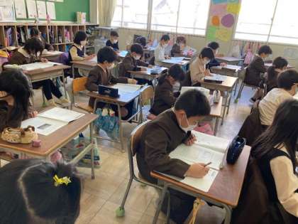 今日、明日と大阪市内の小学校では、学力経年調査を実施しています。初めて挑戦する3年生も、緊張しながらも頑張っていました。きようは、国語と社会科、明日は、算数と理科です。5.6年生は英語も実施します。